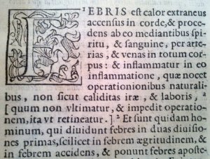 Hát nem gyönyörű? Még az iniciálékat is szépen kidolgozták. Például ez a fejezet, alább, a lázról szól, melynek helye: második kötet – tomus secundus, negyedik könyv – liber quartus, FAN primus, Tractatus primus (első traktátus), első fejezet – capitus primus: