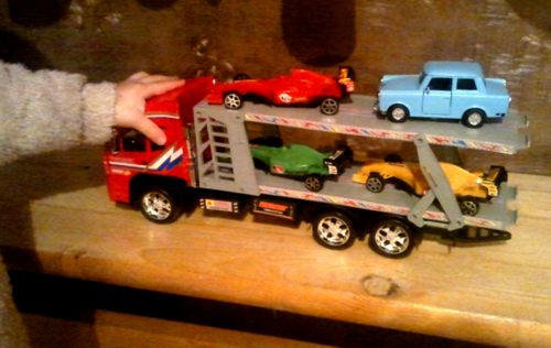 Ennek az álomnak a terméke a képen látható kombináció. Egy olyan tréler, amin a Forma 1-es autók között egy kék trabant (“tabi” – ahogy a töpörtyűk mondják) áll. A nagy családban a “kék tabinak” kultusza van a kis gyerekek között, ami annak köszönhető, hogy feleségem egyik unokatestvére (Bauman Péter) nagyon pöpec gépet hajt. Kétütemű kasztni, megerősített futóművek és négyütemű bikaerős volkswagen motor. Azzal aztán lehet csapatni…
