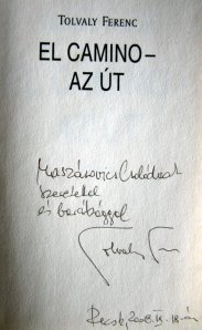 Így pár év után kezembe vettem a könyvet, aminek címe: El camino – Az út (írója Tolvaly Ferenc). Kolléganőim régóta ajánlották, most Édesanyám könyvespolcán megláttam, kölcsönkértem. Nem is akármilyen példány, mert az író 2008-ban egy író-olvasó talákozón dedikálta is.