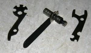 21. A kép két szélén pedig azok a bicikli szerelő általános szerszámok láthatók, amik könnyűek, tehát elférnek egy kis táskában és bizonyos szempontból helyettesíthetnek néhány fent leírt szerszámot, villáskulcsot. Utazáshoz jók, de egy felszerelt műhelyben nem használjuk már.
