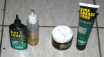 A jobb oldali kép bal oldalán látható két különböző minőségű olaj. A fekete flakonos speciálisan láncolajozáshoz kell (elég drága, de pár csepp elég). A kép jobb oldalán pedig a csapágyak zsírzásához szükséges olcsóbb és drágább változat.