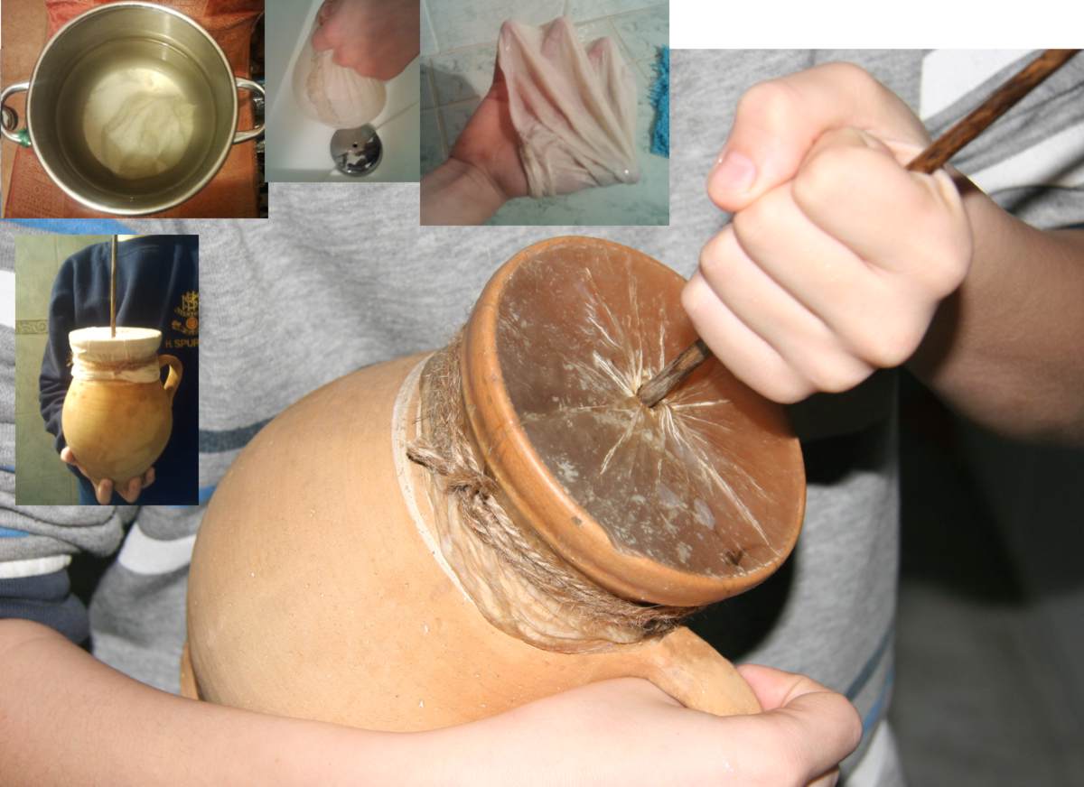 Aztán alapos kimosás után belekötöttük a nádszálat, majd a hógyag-hártyát rákötöttük egy Jóska papától (Maszárovics József) megörökölt köcsögre… Száradás.