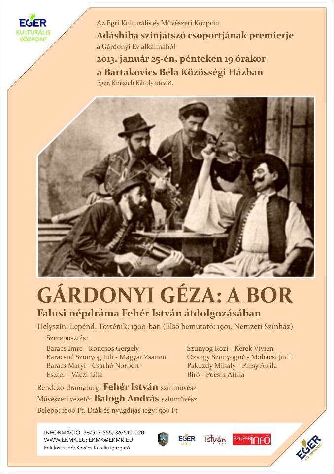 Gárdonyi Géza 1901-ben írta színműírói munkásságának legjelentősebb darabját, aminek a címe: A bor. A Wikipedia információi szerint a színikritikusok néhány kivételtől eltekintve kedvezőtlenül fogadták, a közönség azonban szerette a darabot. Olyannyira megszerették, hogy még falusi színjátszókörben is játszották.
