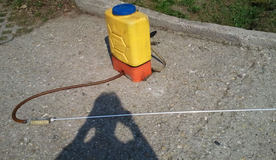 Az igazi klasszikus háti permetező (még édesapámtól örököltem meg), amire jó rátennia  2 méteres szárat, hogy a magasabb fák ágait is elérjük