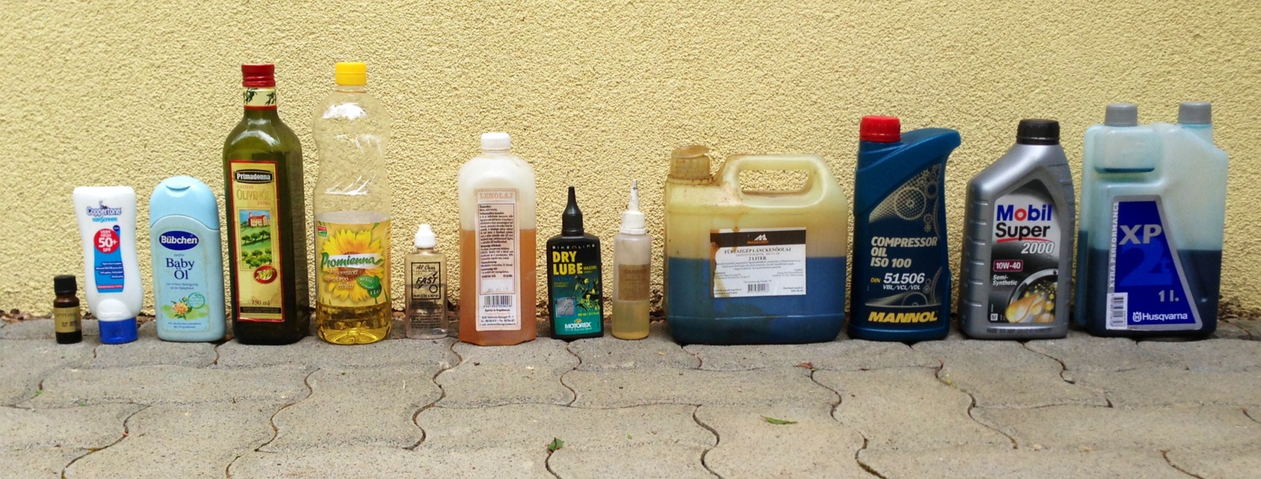 A negyedik jobbról egy kis flakon. Ezzel mindenféle kis gépet, eszközt meg lehet olajozni. Elég tiszta, így a bicikliken is lehet mozgó alkatrészt olajozni vele. De láncolajozáshoz a következőt (jobbról az ötödik flaska) használom, ami profi láncolaj, csak elég drága. A kupakját is megfelelő adagoláshoz alakították ki. Praktikus és annak ellenére, hogy a család összes bringájának a láncát olajozom vele, egész lassan fogy.