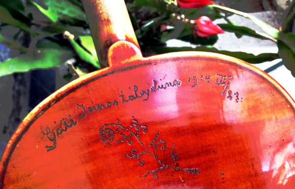 Hogy ki lehetett az a Gáti János? Nem tudtam kideríteni. Minden esetre 1914-ben, éppen száz évvel ezelőtt kapott vagy vett egy hegedűt, amibe tűvel “belegravírozta” a saját tulajdonjogát.