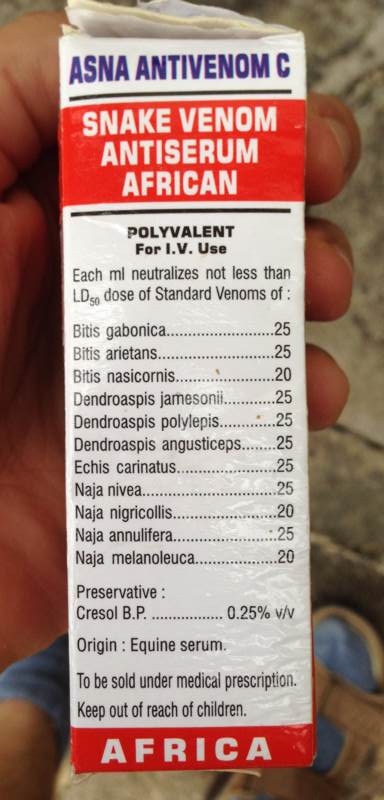 Rajta a kígyók felsorolásával: Bitis gabonica, Bitis arietans (puff adder – puffogó vipera), Bitis nasicornis, Dendroaspis jamesonii, Dendroaspis polylepis (black mamba), Dendroaspis angusticeps, Echis carinatus (Ázsia kedvéért), Naja nivea, Naja nigricollis (feketenyakú), Naja annulifera, Naja melanoleuca – no, ezek a naják, vagyis a kobrák. Nincs köztük a Naja haje – az egyiptomi kobra, mert az Délen nem él. Ugyanakkor rajta van az Echis carinatus (?), mert a gyártmány indiai, bár Afrika számára gyártják.