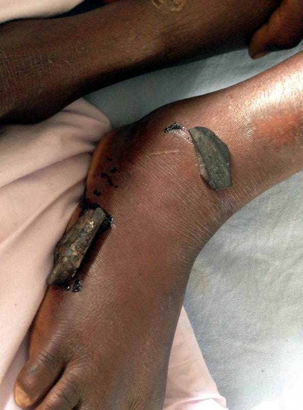 Kövek a megmart végtagra ragasztva, népi gyógyászat (saját felv.)
