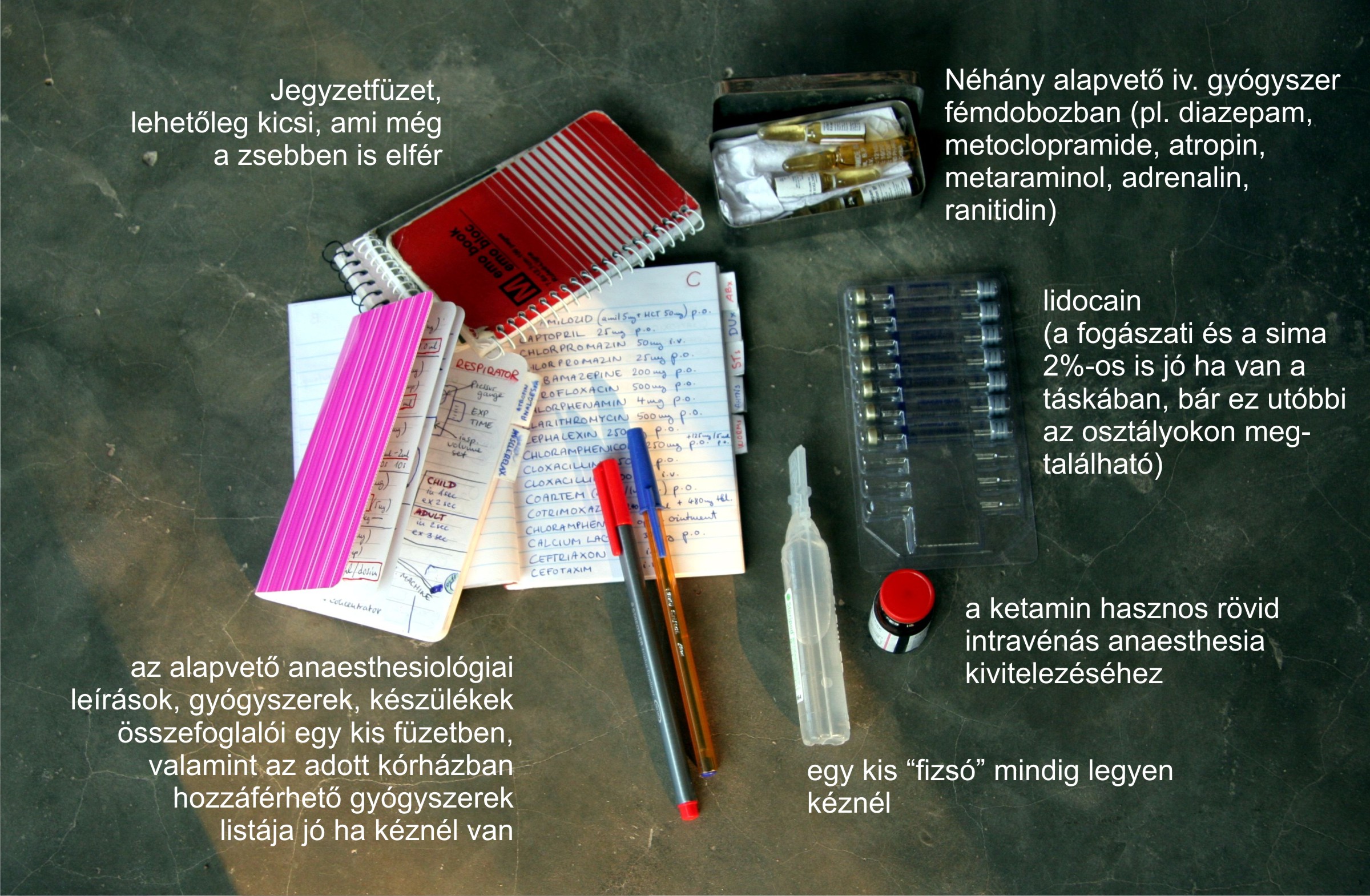 A baloldali következő képen láthatóak egyéb hasznos dolgok. A jegyzetfüzetet nem kell magyarázni: kicsi, zsebbe való. A rózsaszín borítós noteszbe viszont a betegek altatásához alapvető gyógyszerek, eszközök adatai, a beállítási paraméterek, gyógyszermellékhatások, adagok szerepelnek. Persze, ezek egy része megtalálható a BNF-ben, vagyis a British National Formulary-ban (a brit gyógyszerkönyv), de jobb, ha az ember a gyakran használatos dolgokat kigyűjti magának. Sőt, Afrika fejlődő országaiban az is fontos, hogy az adott kórházban ismerjük a hozzáférhető gyógyszereket. Ezt egy harmadik kis noteszban magam is megtettem. Így ha az ember szeretne adni valamilyen szert, azonnal leellenőrizheti, hogy meg van-e a kórházban. Nyilván, ha nincs, akkor fel sem írjuk, el sem rendeljük. További hasznos eszköz a piros toll vagy filctoll. Ha egy betegen, mondjuk egy tályog miatt metszést ejtünk, akkor a helyzetet érdemes a beteg kártyájára leskiccelni. Ebben segít a két szín, például pirossal jelölhetjük az elváltozást. Foghúzáshoz hasznos a lidocain+adrenalin keverék (nem részletezem), egy kis fiziológiás, steril sóoldat és egy ampulla ketamine (altatáshoz) is jó, ha van a táskában. Kisebb, egyéb intravénás gyógyszert védelemből fémdobozkába raktam, nehogy összetörjenek a táskában.