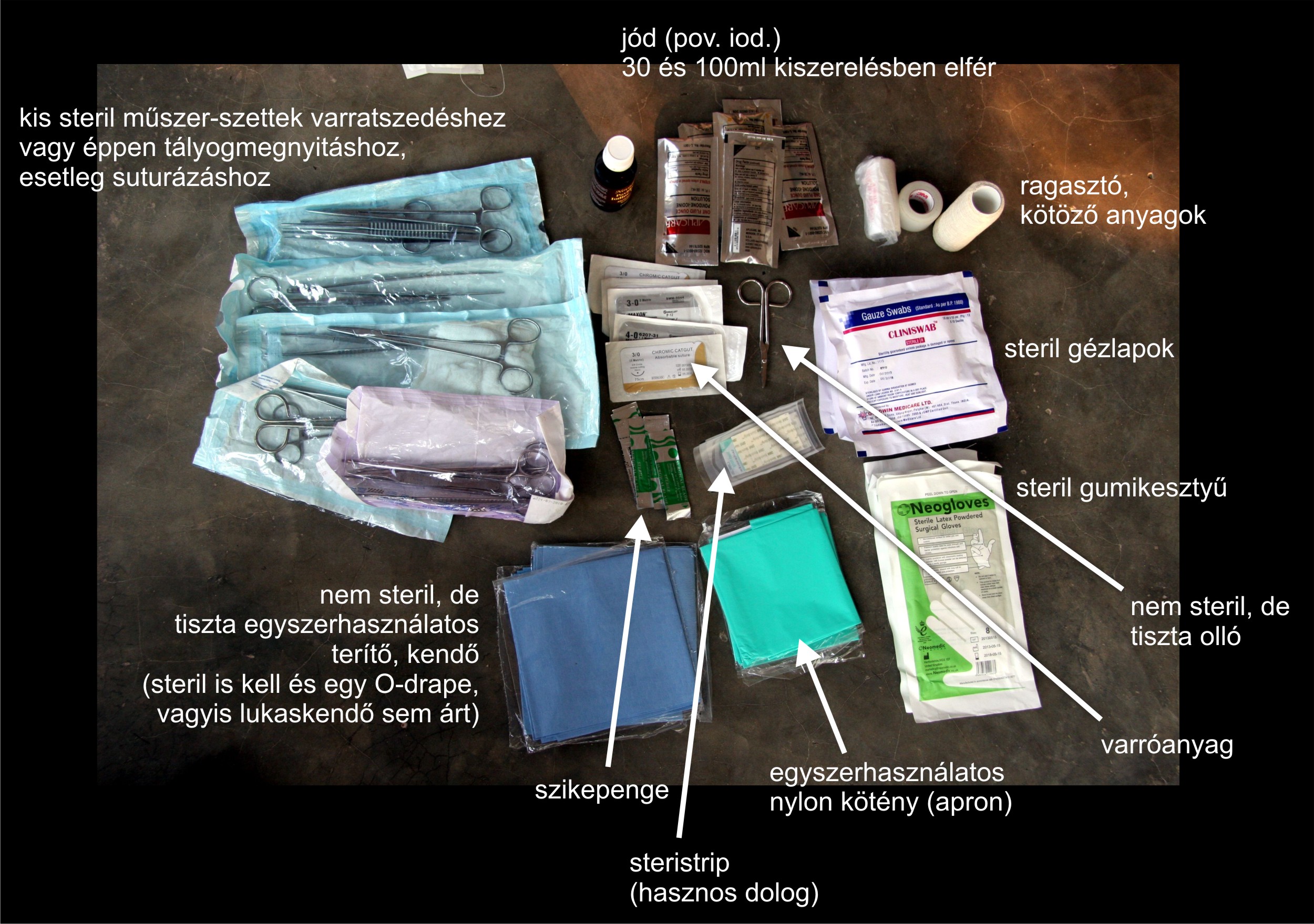 Minimális sebészetet művelni nem kell félnetek, jó lesz… Sőt, nemcsak, hogy nem kell félni, hanem nagyon is szükséges. Ahogy fentebb említettem, a világnak több pontján is (pl. Afrika távoli vidékei) nagy az orvoshiány. Itt nem válik olyan élesen szét a sebészet és a belgyógyászat. Minden orvosnak mindennel kell foglalkoznia bizonyos szinten. Ez elképzelhetetlen a nyugati világban, ahol szakvizsga vagy éppen specialisták felügyelete nélkül meg van kötve az ember keze. De ahol nagy a hiány, ott nem kerülhető el a sebészet alapvető gyakorlása. Ennek része az, hogy egy tályogot meg kell tudni nyitni és be kell tudni drenálni (csövezni). Sokszor varratot szedni (műtét után) az osztályokon kell. De van, hogy metszett sebet gyorsabb pár öltéssel egy kezelőben megoldani, mint arra külön helységben, kisműtőben nekikészülődni. Természetesen az aszepszis szabályai mindenütt betartandók. Ehhez elengedhetetlenek a steril eszközök. Varróanyagból a rendelkezésre álló lehetőségek közül érdemes párat beválogatni a táskába. Nagy vérzésnél irány a műtő, de kisebb sebek vékony – 3-0-s fonalakkal – elláthatók. Steril kesztyűnek, szikepengének, köténynek, steril géznek lennie kell a táskában.