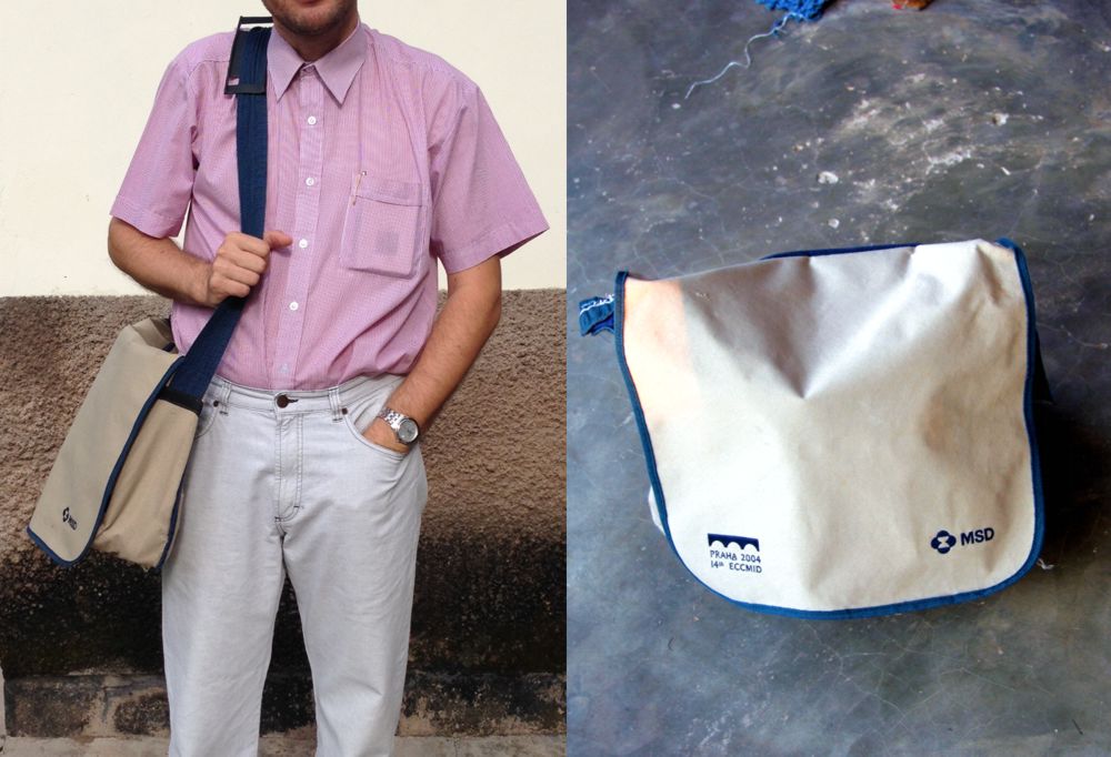 Ennek oka részben az, hogy nincs meg minden betegellátó osztályon minden apró eszköz, másrészt sokkal gyorsabb valamit előkapni a tatyóból, mint várni arra, hogy összeszedjék az asszisztensek, ápolók a szekrényekből, polcokról. Magam ezt a mellékelten látható 2004-ből való konferencián kapott oldal-reklám táskát fogtam be erre a célra. Több mint tíz éves és néhány reparáló varrással, kiegészítéssel még mindig a legkényelmesebb és könnyedén rendezhetőek benne az eszközök.