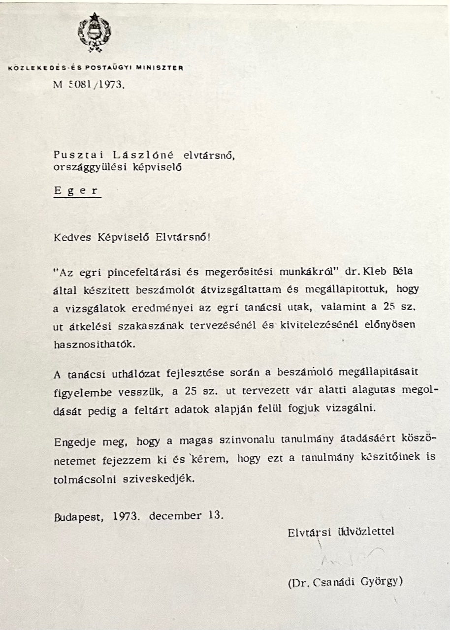 Végül a miniszteri levél (forrás – szintén Kleb Béla: Eger múltja a jelenben c. könyve):